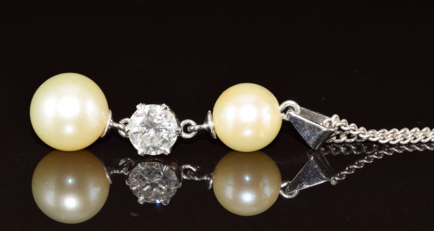 An 18ct white gold pendant set with a round cut diamond of approximately 0.8ct and two cultured pearls, measuring approximately 8.4mm & 9.6mm, 3.8cm, 3.2g
