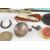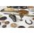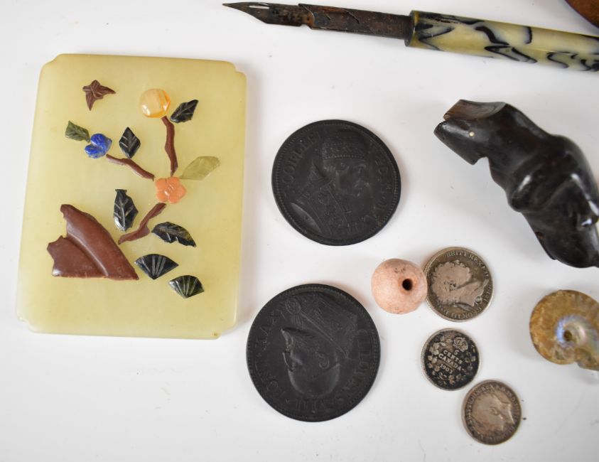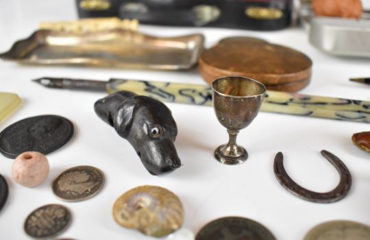 Bijouterie and collectables including miniature hallmarked silver goblet, coin dish, silver coins, hinged walnut box, dip pens, scent bottle, bone needle case, miniature Dresden cup, miniature cased violin and bow, 19thC seal of Mercury, Chinese fantasy coin/token etc