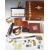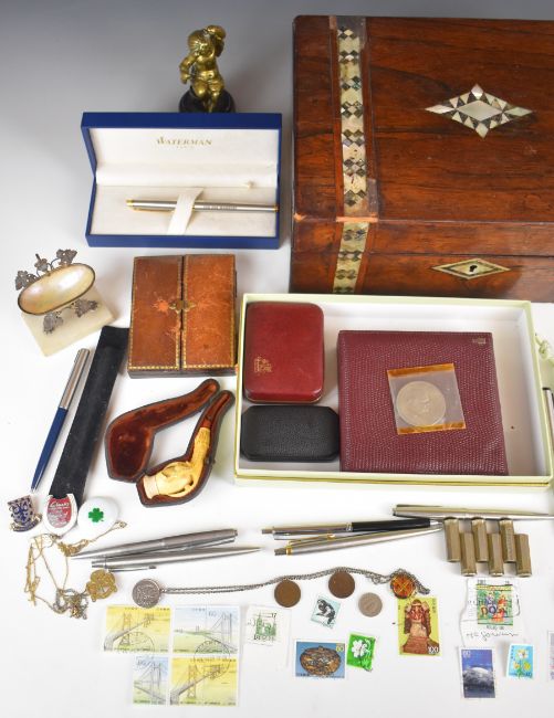 Collectables including Waterman, Parker and Swan pens, Masetro mouth organ, mother of pearl salt or similar, cased pipe, portrait miniature and further box, cased vintage gold plated spectacles, badges including Clarks lucky-two-shoe club and City Livery Club, cufflinks, Penhaligon's box, rosewood mother of pearl inlaid box and a pair of brass putti figures