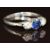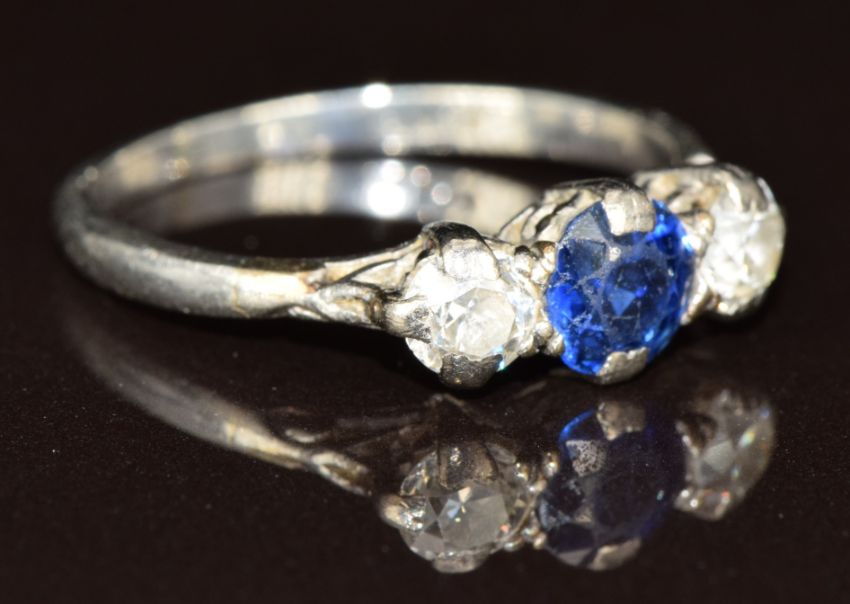 An 18ct gold ring set with a round cut sapphire of approximately 0.5ct and two diamonds, each approximately 0.2ct, 3.5g, size N
