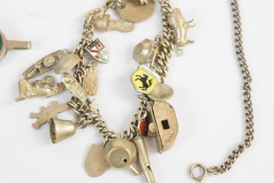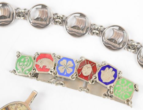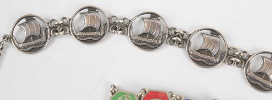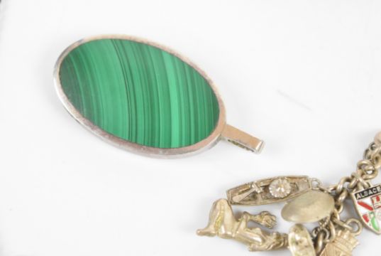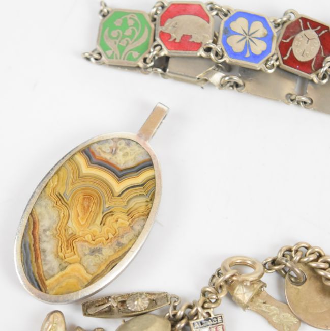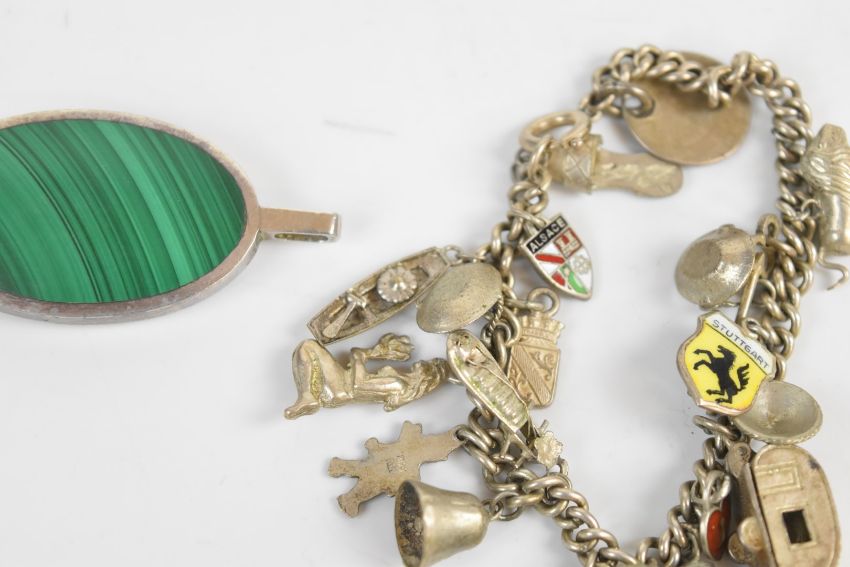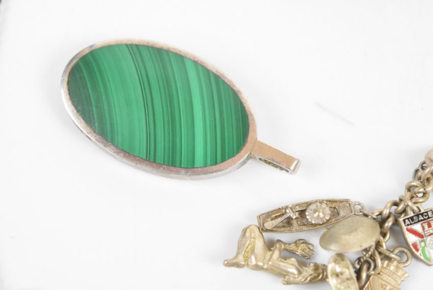 A silver necklace by COF Denmark, silver charm bracelet, enamel bracelet and silver pendant set with malachite and lace agate