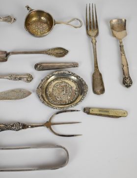 Hallmarked silver items including two tea strainers, embossed pin tray, fiddle and thread pattern sugar tongs, Georgian caddy spoon and folding fruit knife, length of longest 20cm, 315g weighable silver