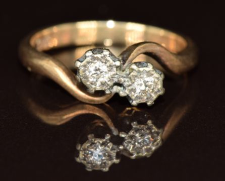 A 9ct gold ring set with two diamonds in a twist setting, 2.6g, size K