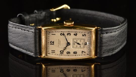 J W Benson 9ct gold gentleman's wristwatch ref. 364 with inset subsidiary seconds dial, blued Breguet hands, Arabic numerals, silver dial and 19 jewel movement, on black leather strap, case diameter 22mm, serial number 27362, in original fitted box with outer card box, guarantee and additional brown leather strap.