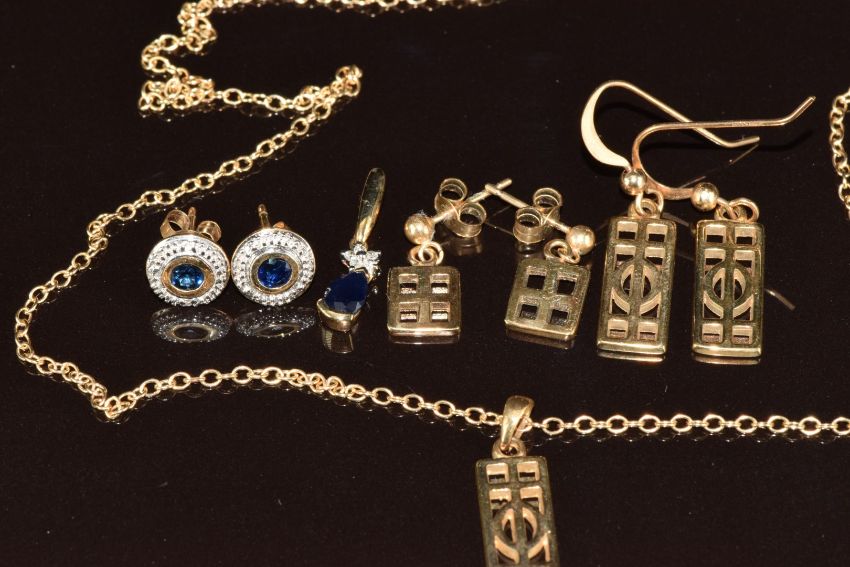 A 9ct gold pendant set with a sapphire and diamond, a pair of 9ct gold earrings each set with a sapphire and diamonds, two pairs of 9ct gold earrings and a 9ct gold pendant on chain, 9.5g