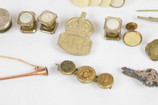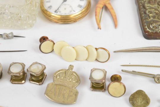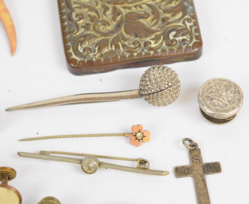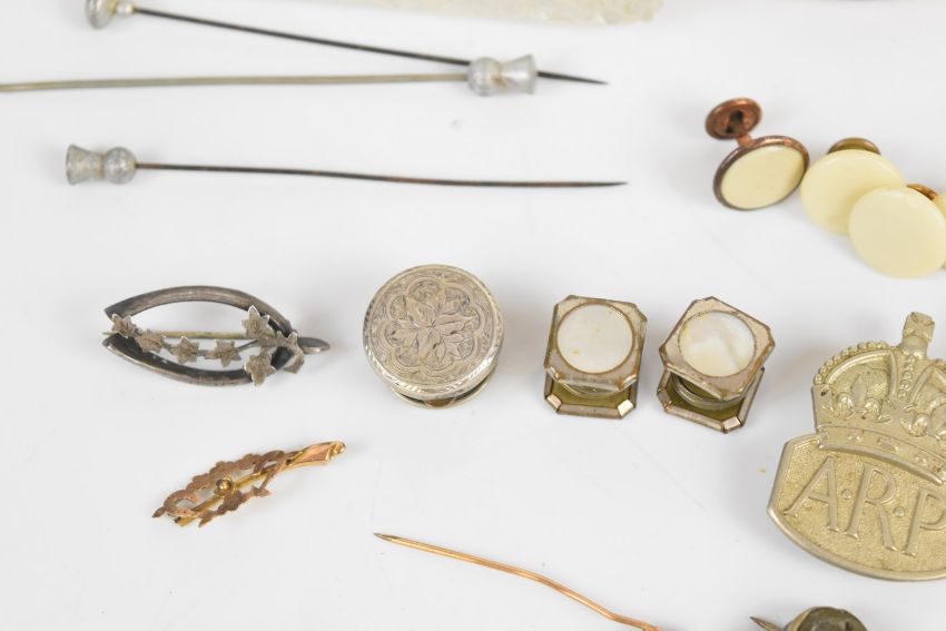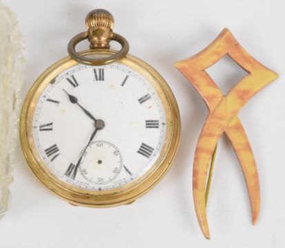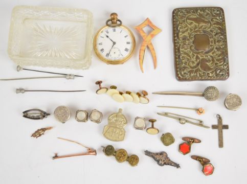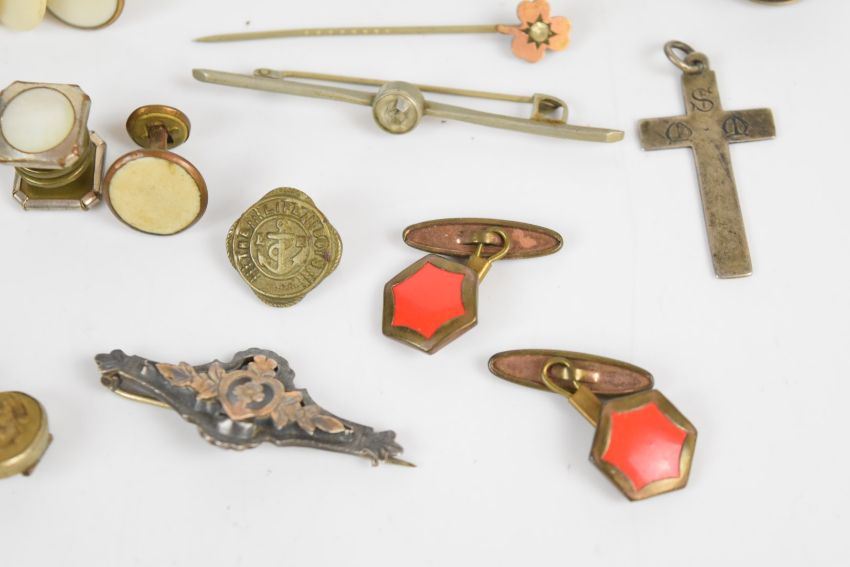 A collection of jewellery including lava cameo brooch, Victorian silver faced buttons, silver cross pendant, rolled gold brooch, two Edwardian silver brooches (Chester 1902, Birmingham 1909), gold plated pocket watch, section of 9ct gold brooch (0.5g), etc