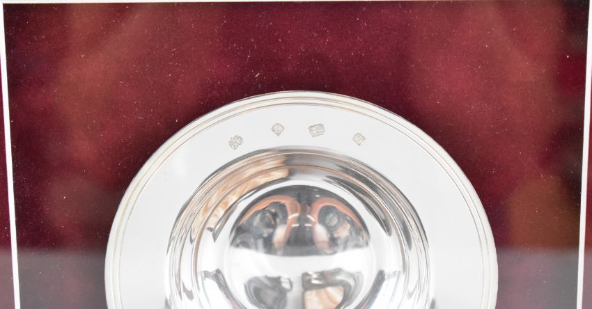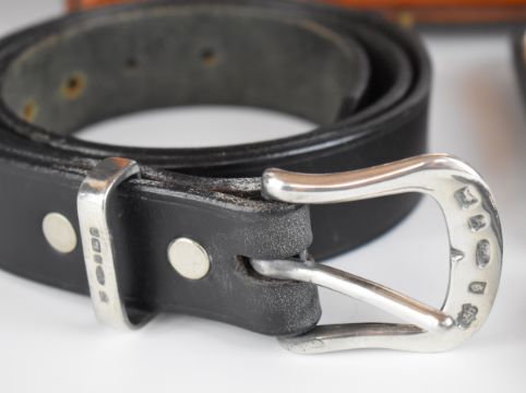 Elkington & Co. feature hallmarked silver pin dish, diameter 12cm, in glazed frame, feature hallmarked silver mounted leather belt and a cased set of hallmarked silver teaspoons, weight 83g