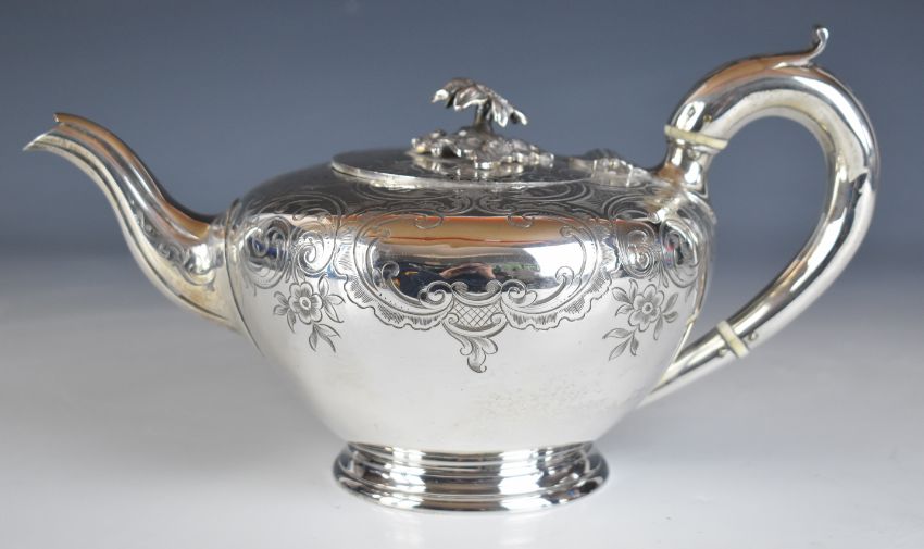 Victorian hallmarked silver teapot of bulbous form with engraved decoration and floral final or knob, London 1847, maker John James Keith, length 27cm, weight 674g all in, with ivory licence