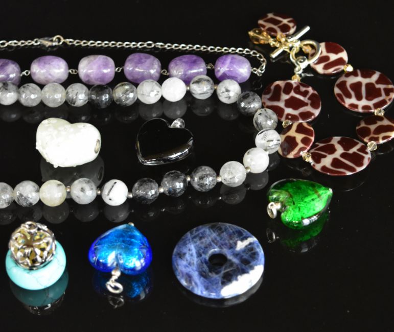 A silver and amethyst necklace, five hardstone / shell bracelets and necklaces, six glass pendants a and silver pendant