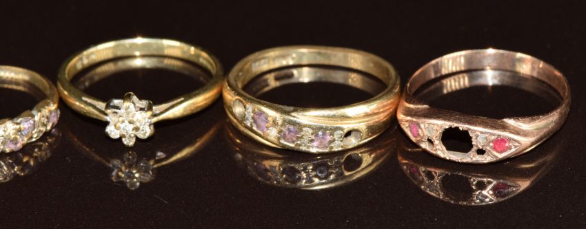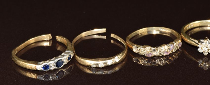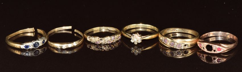 Six 9ct gold rings set with sapphires, diamonds, amethysts, etc (all damaged or missing gemstones), 9.6g