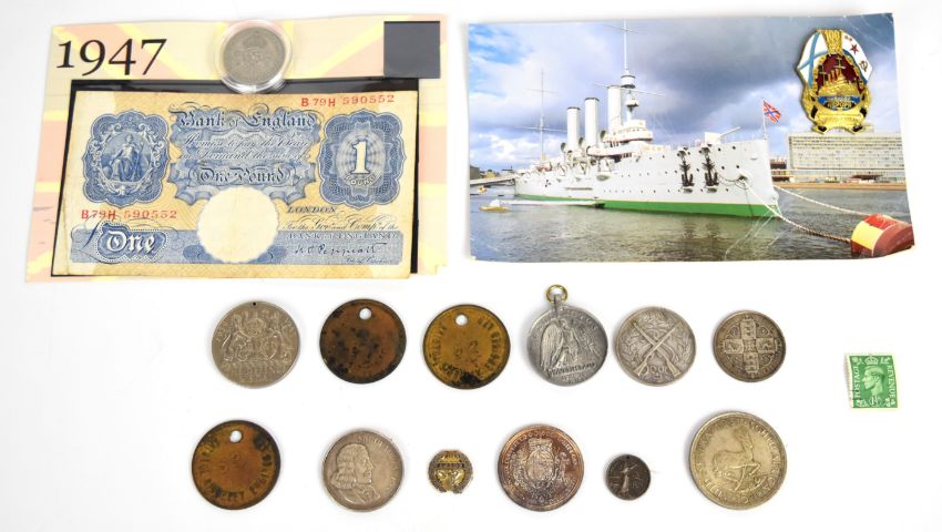 South African 1951 five shillings together with a 1966 1 Rand, Queen Victoria Gothic florin, miniature Queen's South Africa medal, Defence Medal, Bristol Siddeley tokens, £1 notes etc