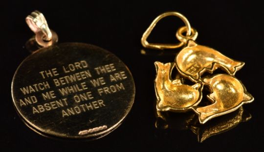 A 9ct gold St Christopher (1.7g) and 18ct gold pendant in the form of dolphins (2.3g)