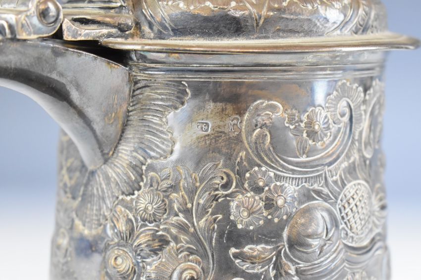 Large two pint hallmarked silver lidded tankard with scroll handle terminating in a heart, the main body and lid with embossed decoration, London 1752, maker's mark indistinct, height 22cm, weight 1162g