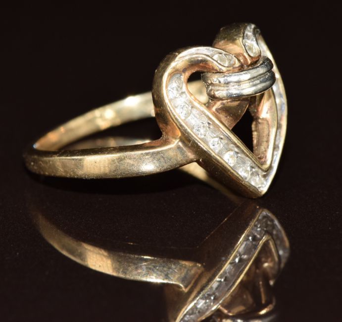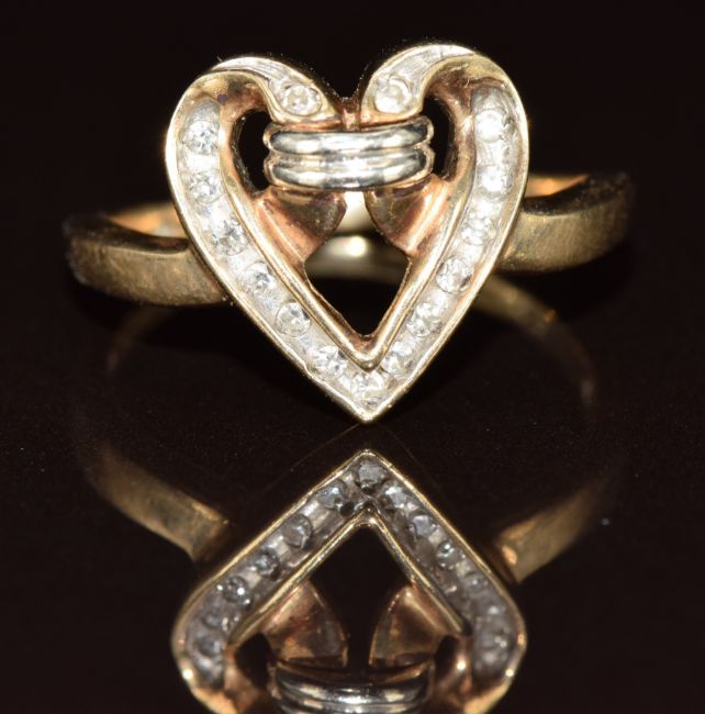 A 9ct gold ring set with diamonds in a heart shaped setting, 3.1g, size O