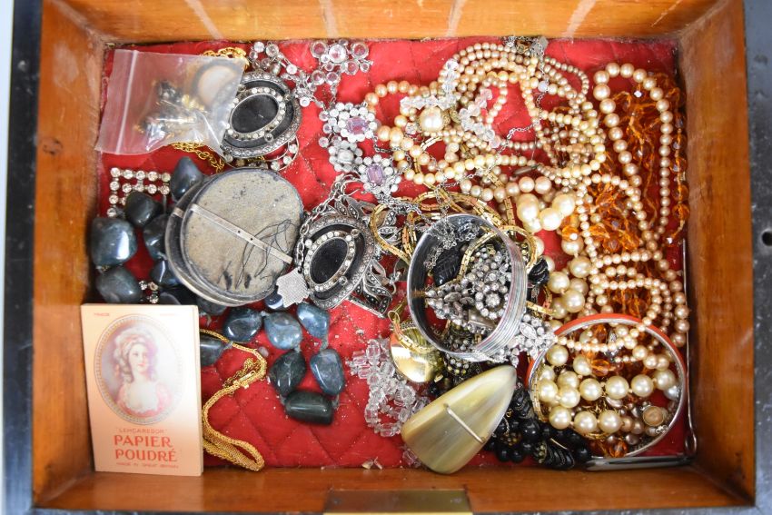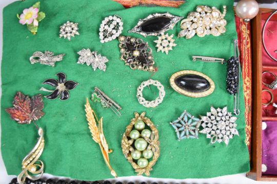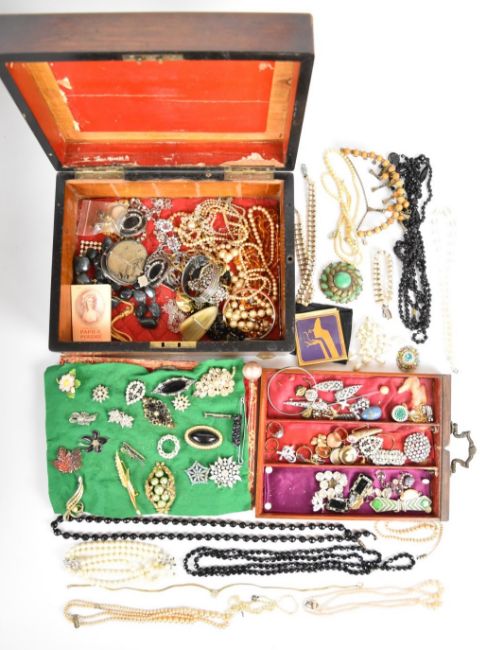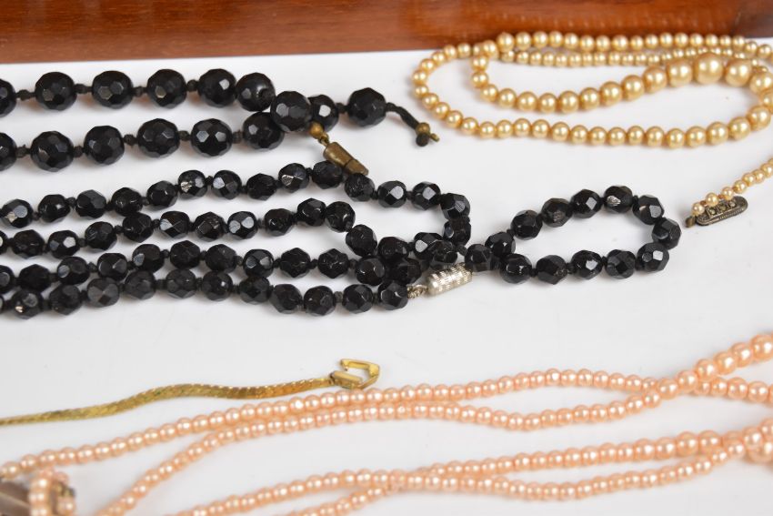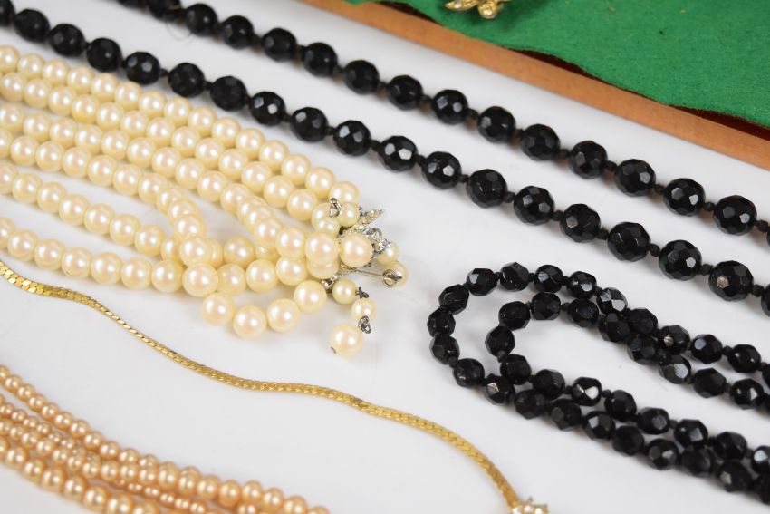 A collection of Victorian and Art Deco costume jewellery including paste brooches, Art Deco beads, necklace and buckle and 9ct gold chain (3.8g)