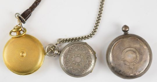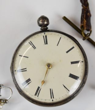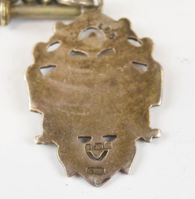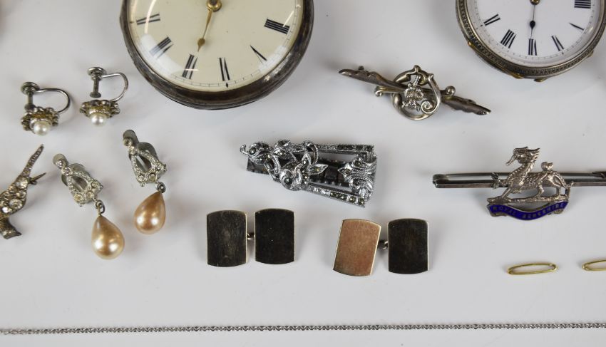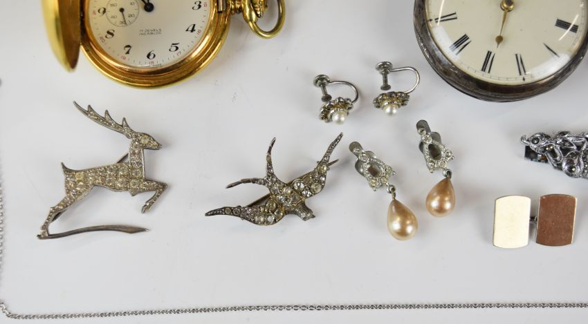 Two silver brooches, two silver pocket watches including one by Richard Cole, Ipswich, silver fob, pair of silver cufflinks with 9ct gold finish, two paste set brooches in the form of a deer and swallow, etc