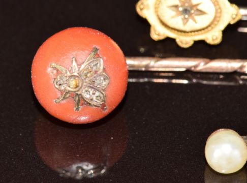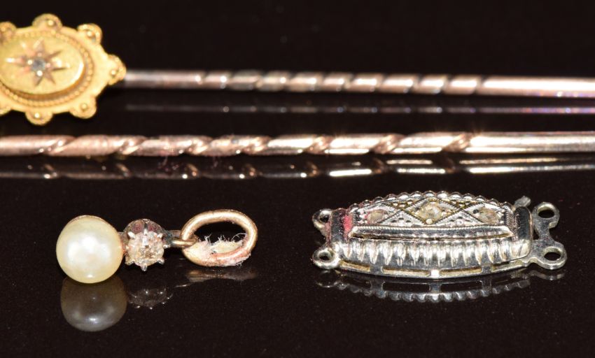 Victorian coral stick pin set with rose cut diamonds in the form of a fly (3.6g), a 15ct gold stick pin set with a diamond, in antique box, 9ct gold pendant set with a diamond and pearl (0.5g) and a 9ct white gold clasp set with diamonds (0.9g)