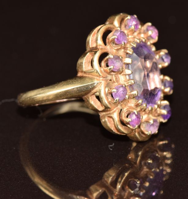 A 14k gold ring set with an oval cut amethyst surrounded by further round cut amethysts, 5g, size L