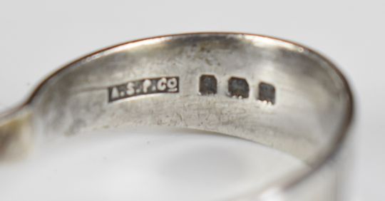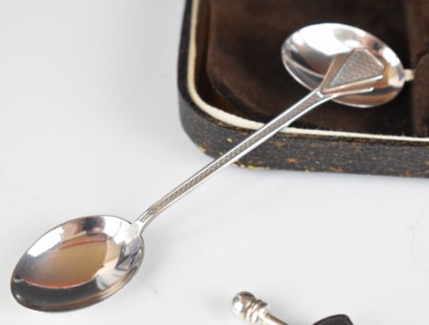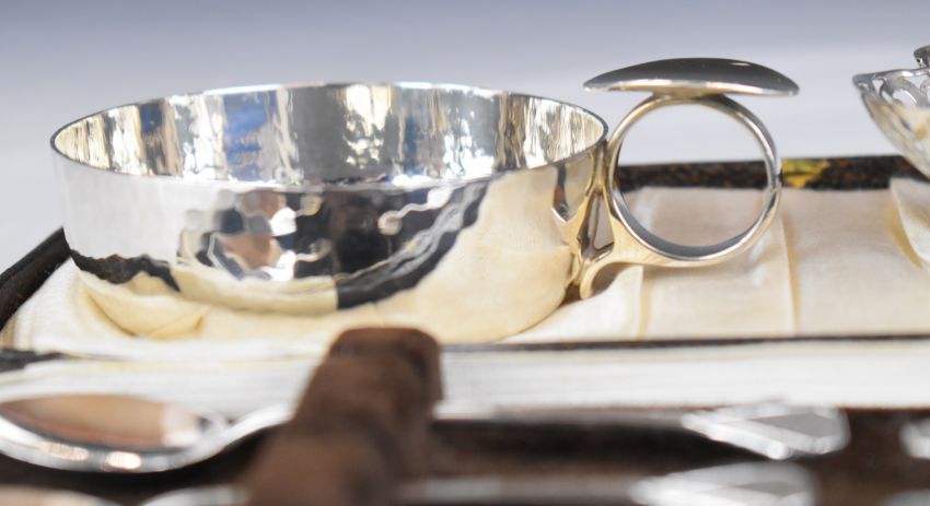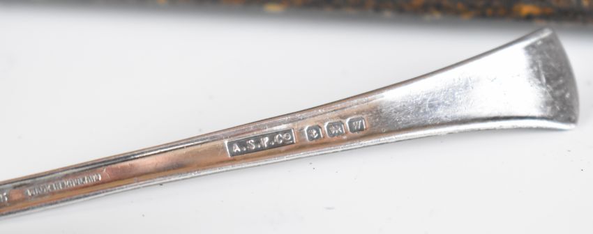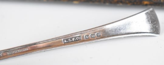Hallmarked silver items comprising Victorian bon bon dish, Birmingham 1898, maker Johnson, Durban & Co Ltd, diameter 11cm, modern hallmarked silver ashtray with Arts and Crafts style hammered finish, modern hallmarked silver candle snuffer, baby's pusher and pap spoon and a cased set of Art Deco hallmarked silver coffee spoons, Birmingham 1942, maker J B Chatterley & Sons Ltd, weight of all, items 254g