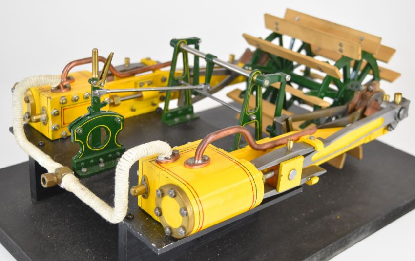 Live steam twin cylinder South American model paddle steamer engine, built by the award winning late Harry Clyne. On wooden base with single stern wheel between the cranks, the two cylinders controlled by Allen straight link twin eccentric valve gear, operated by a reversing quadrant, overall length of base 46cm