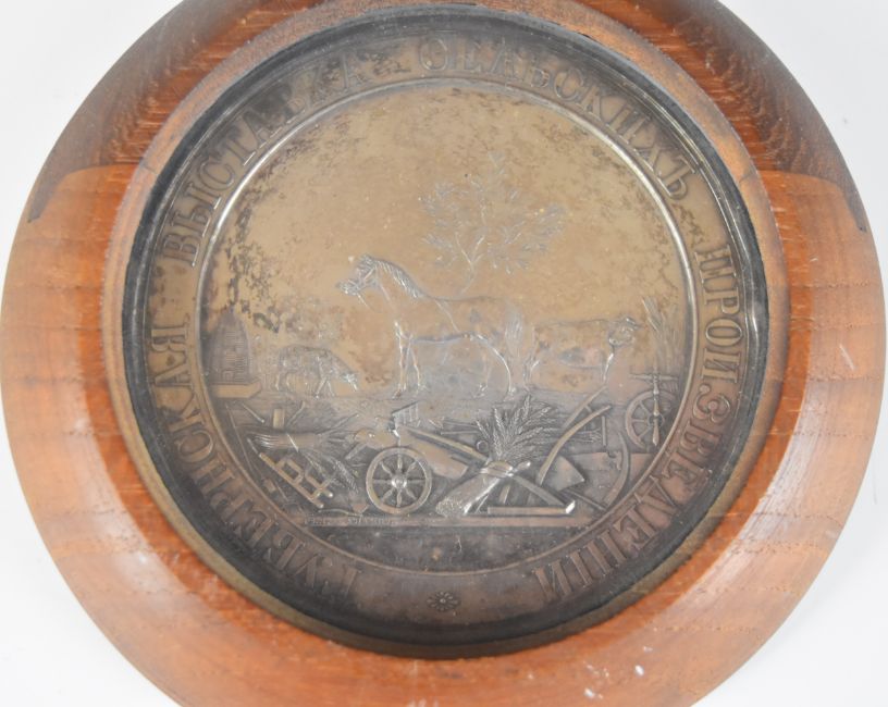Russian rural or agricultural interest medallion with horse, cow, sheep, beehive and crops, diameter 9.5cm, in turned wood frame