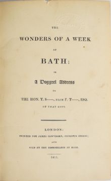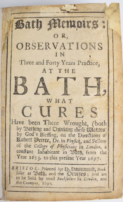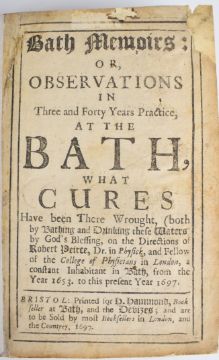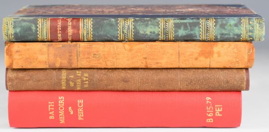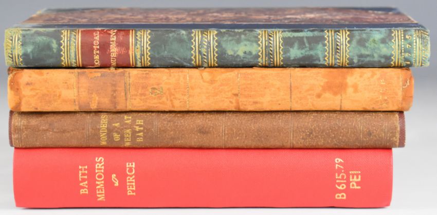 Bath Memoirs: or, Observations In Three & Forty Years Practice At The Bath, What Cures Have been there Wrought (both by Bathing and Drinking these Waters) by Gods Blessing on the Directions of Robert Peirce Dr. in Physick and fellow of the College of Physicians in London, a constant inhabitant of Bath from the Years 1653 to this Present Year 1697 printed for H. Hammond 1697 being 2 volumes (bound in one – and without map) Recently re-bound in cloth. [John Cam Hobhouse] The Wonders Of A Week At Bath in A Doggrel Address To The Hon. T. S--, from F. T-- Esq of that City printed for James Cawthorn 1811 first edition in gilt lettered cloth (re-backed & original spine re-laid). [Anna Riggs Lady Miller] Poetical Amusements At A Villa Near Bath printed by R. Cruttwell 1775 first edition with engraved frontispiece bound in half leather WITH volume 2 issued 1776 in full tree calf, all Ex. Bath Library (4)