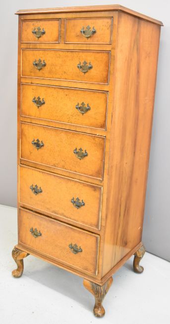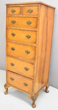 Reproduction burr walnut chest of two over five graduated drawers, W48 x D40 x H120cm