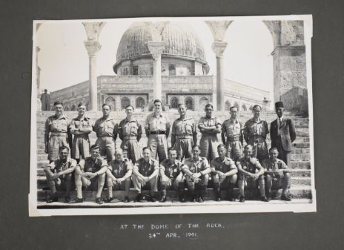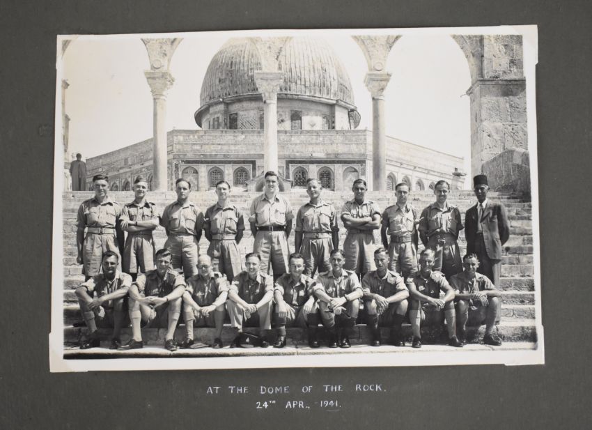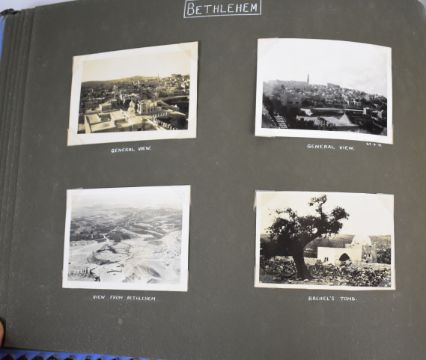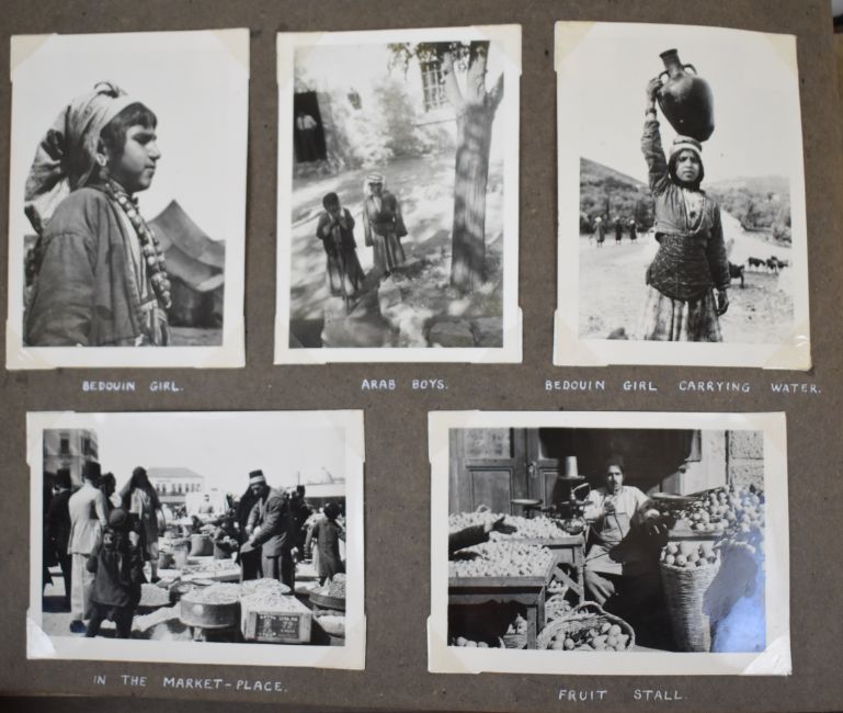 [West Asia] Two albums from the 1940s with photographs from Palestine, Syria & The Lebanon, images include a busy scene at Ghazale Station, the Deraa, Zeizun and Qanawat stations, a desert bus, Mosque of Omayad and Tekkiye, Damascus street scenes, an Arab coffee shop, Bedouin girls, Arab boys, grain pounding and laden camels, harbour & streets views from Beirut and views of Baalbeck and Bacchus Temple, Tulkarm railway station & urchins besieging the train in Gaza, images from Tel-Aviv and Haifa, panoramic scenes of Nazareth, coast of Galilee, Jericho and The Dead Sea, Bethlehem and Church of The Nativity, Jerusalem and the War Cemetery, The Wailing Wall, Damascus Gate and daily street scenes at the Via Dolorosa. Both albums with neatly written captions and many dated, approximately 280 photos (2)