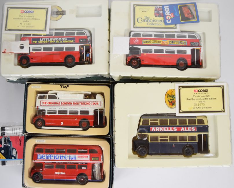 Five Corgi Classics The Connoisseur Collection diecast model buses, all in original boxes.