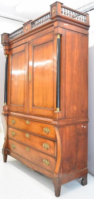 Biedermeier oak dresser / linen cupboard with bobbin turned gallery top, fitted interior with arrangement of shelves and drawers, arched supports below ebonised pillars and three straight graduated drawers, raised on square tapering legs, W166 x D57 x H236cm