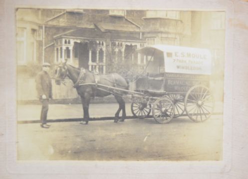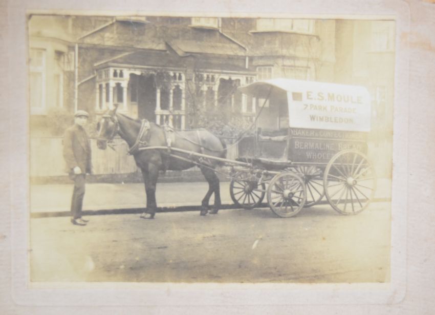 Early veteran motoring / London interest photographs / ephemera including Daimler and similar cars, some with annotations verso 'Haskins 1911, 1910, 1913' group photograph, 'Shed no.11 4SD Ruislip' and a covered horse and cart for 'E S Moule 7, Park Parade Wimbledon, Baker and Confectioner, Bermaline Bread Wholemeal', largest 16.5 x 22cm