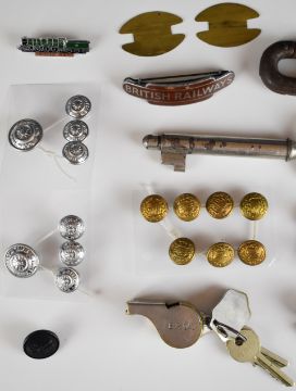 Railwayana to include GWR signal box key, GWR and British Railways buttons, British Railways Western Region enamel cap badge and BR (W) whistle