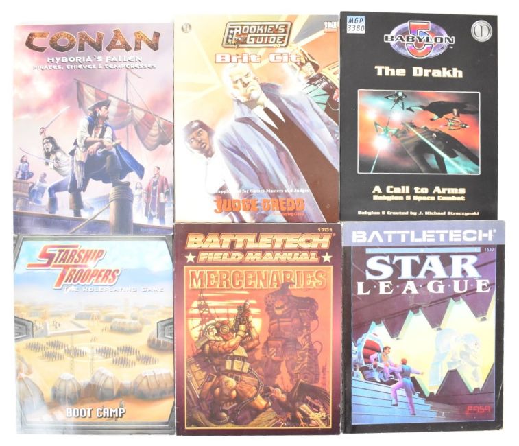 A collection of roleplaying books and supplements to include The Lord of the Rings, Battletech, Conan, The Blood of Heroes, Starship Troopers, Traveller, Star Wars, Manhunter and Vampires.