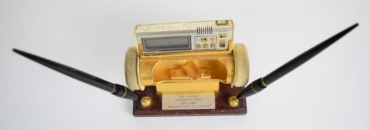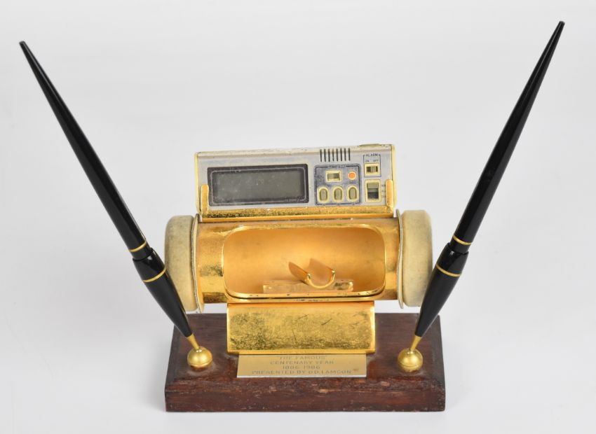 The Famous Cheltenham novelty Lamson cash carrier desk stand, the main body formed as a cash carrier, topped by a digital clock, with plaque to base 1886-1986 from D.D.Lamson, height 23cm