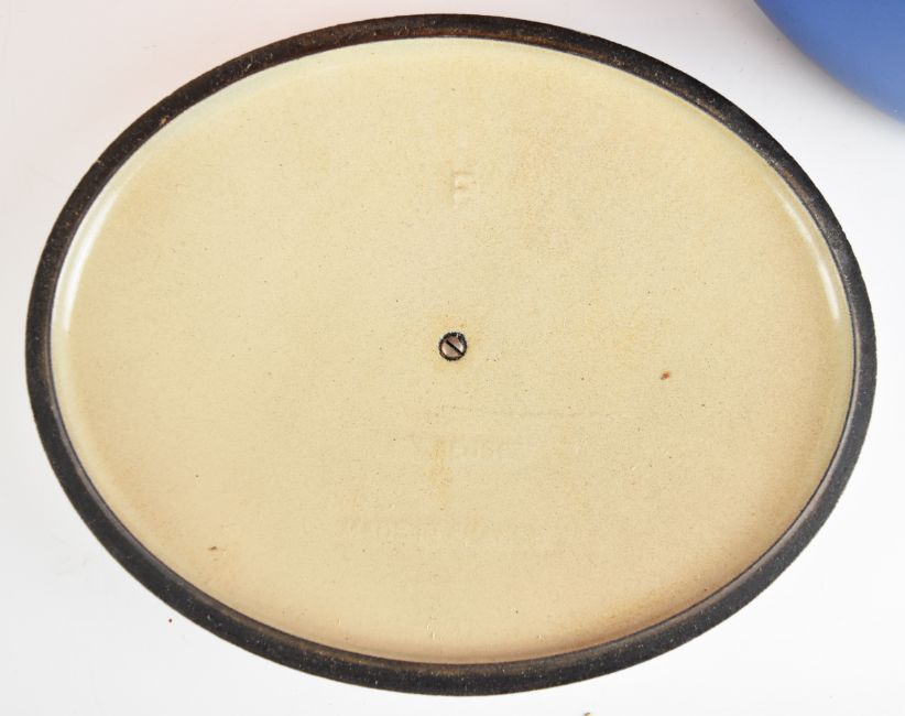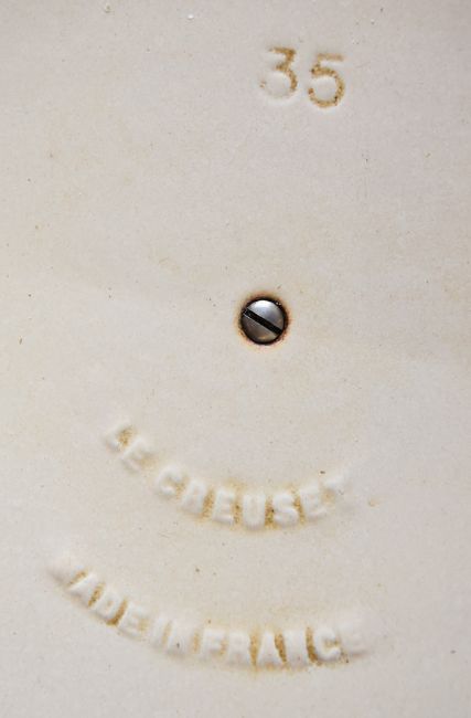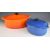 Two Le Creuset twin handled casserole dishes in orange and blue, one marked 'F', the other '35', largest 43cm x H17cm