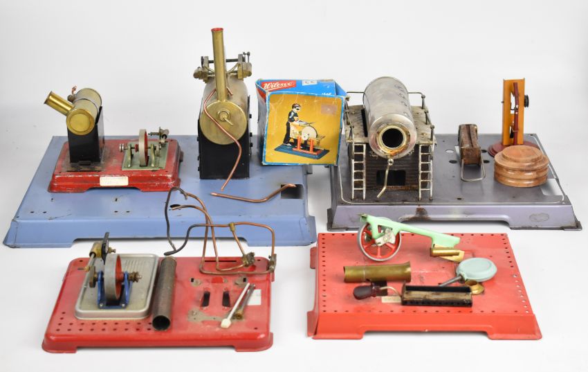 Mamod and other live steam stationary engine bases, boilers, engines and accessories including line shafts, oil cans and a twin cylinder overtype engine