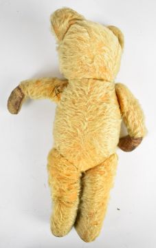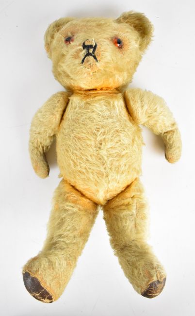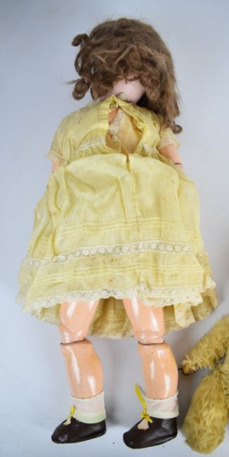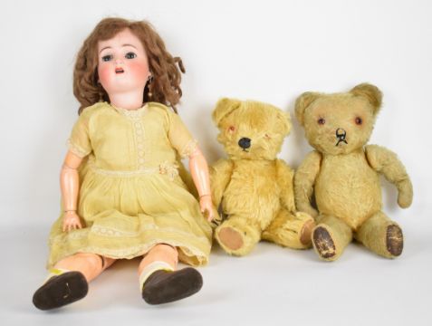 Early twentieth century bisque headed doll with weighted blue eyes, height 60cm, made in Germany 1362, together with two teddy bears.