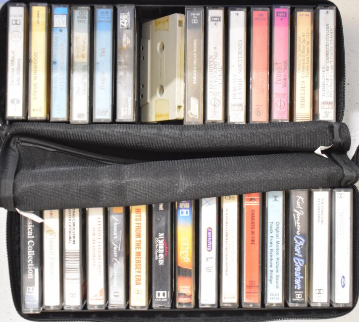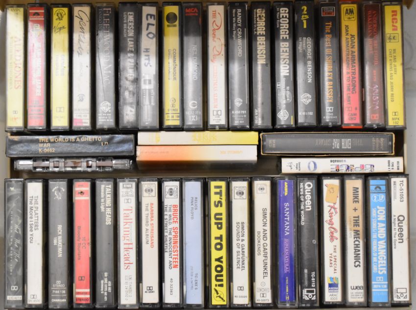Approximately sixty five mixed genre cassettes in three vintage cases including Queen, Santana, Pink Floyd, Talking Heads, 10cc, Genesis, Dire Straits, George Benson, Yes, Stevie Wonder etc