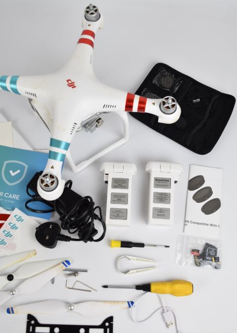 DJI Phantom 3 Standard quadcopter drone with 2.7K camera, remote control, battery packs, carry case and spares, in original box.
