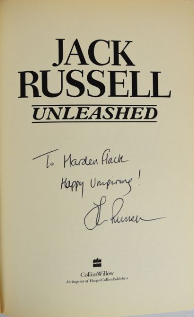 Gloucestershire and Yorkshire original cricket bat signed with autographs of 26 players for the Andy Stovold Benefit Year 1987 together with a signed and inscribed copy of Jack Russell Unleashed 1997 in dust-wrapper
