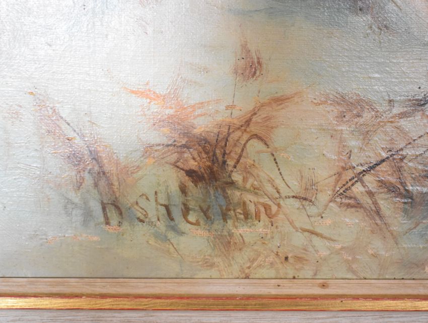 Daniel Sherrin (1869-1940), oil on canvas winter snowy landscape with sheep being herded with sunset beyond, signed lower left, 60 x 100.5cm, in part gilt frame