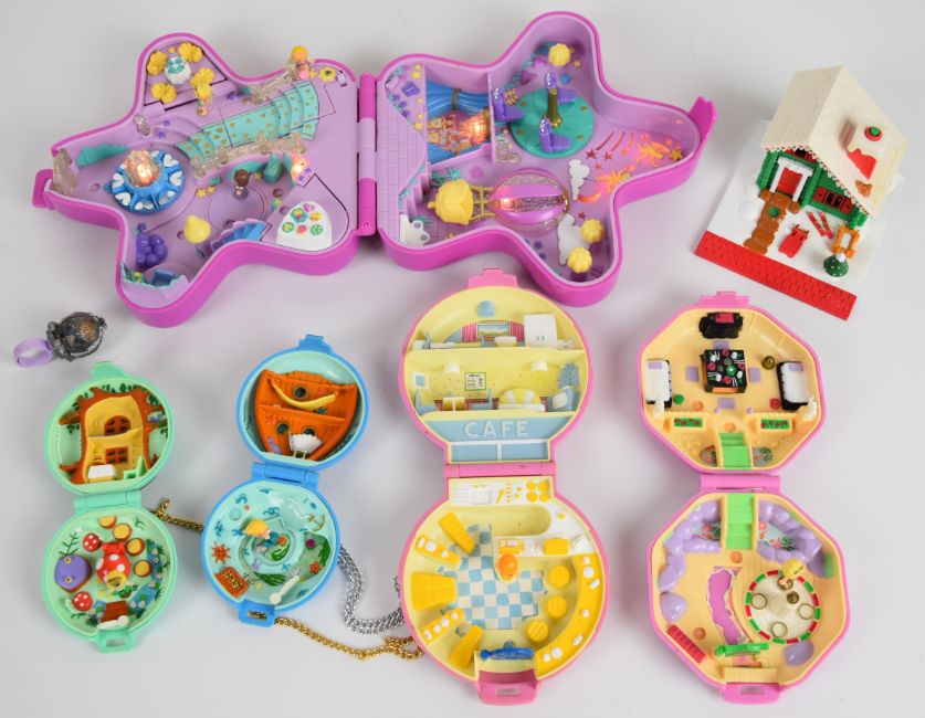 Six Bluebird Toys Polly Pocket playsets together with nine figures and ring, 1990-93.