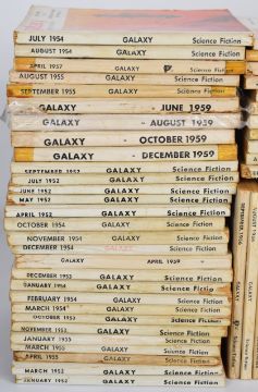 Ninety-two Galaxy Science Fiction digest-size pulp magazines with consecutive runs from 1950-59 and to include issue #1 (Oct 1950), stories by Philip K. Dick, Issac Asimov, Willy Ley, Fritz Leiber, Poul Anderson and Evelyn E. Smith, Galaxy Publishing Corp.
