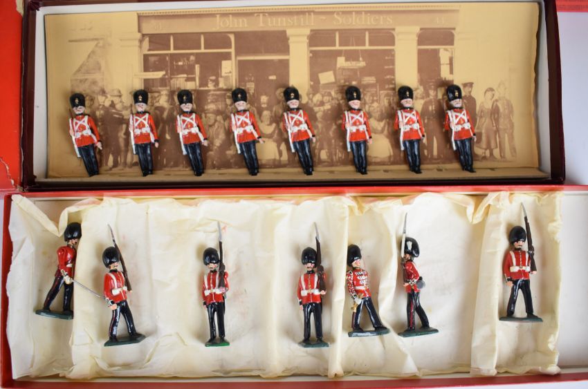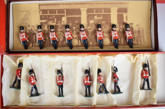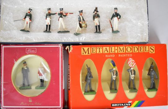 Eleven Britains and similar 1:32 scale metal soldier sets to include Royal Marine Colour Party 7201, Scots Guard Pipers 7241 and Mounted Lifeguards 7205, in original boxes.