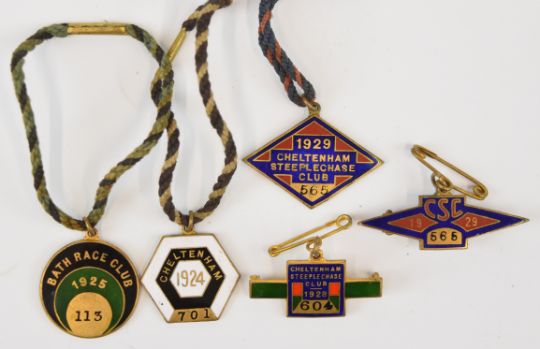 Five enamel horseracing badges comprising three Cheltenham Steeplechase Club / CSC, one 1928 and two 1929, one Cheltenham 1924 and one Bath Race Club 1925