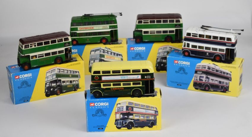 Five Corgi Classics diecast model buses to include Green Line London Transport Daimler CW 35201 x2, Shillibeer AEC Routemaster 35003, Nottingham City Transport Karrier W Trolleybus 34701 and Aston Under Lyne Corporation Sunbeam W 34702, all in original boxes.