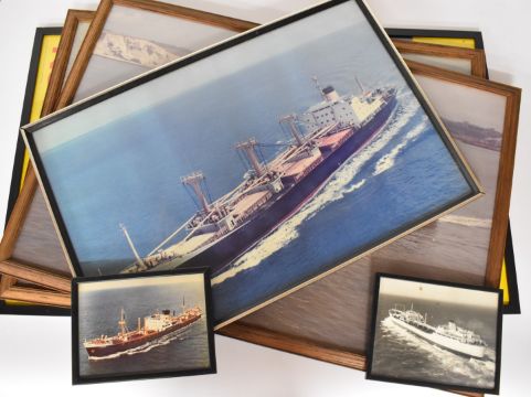 Union Castle Reina del Mar shipping advertising poster with slogan Come Cruising to top, 101 x 61cm, together with three large photographs of Riverbank (Bank line) Ronsard (Lamport & Holt) and two further smaller photographs of ships