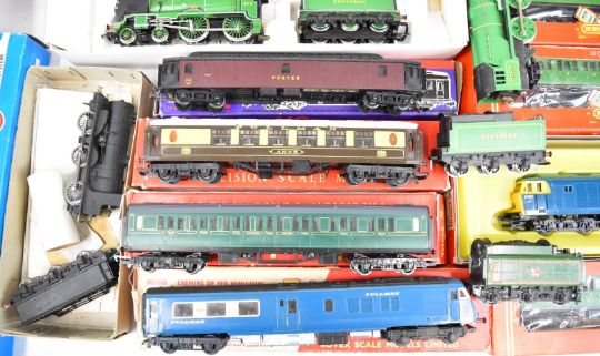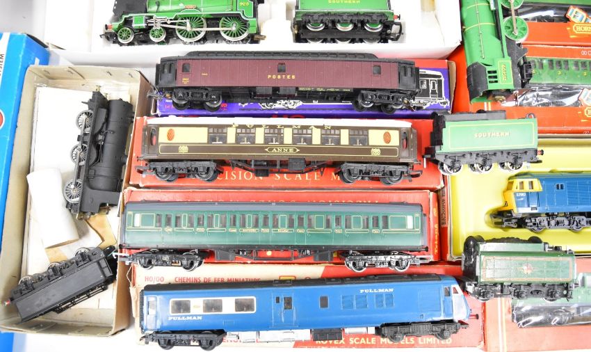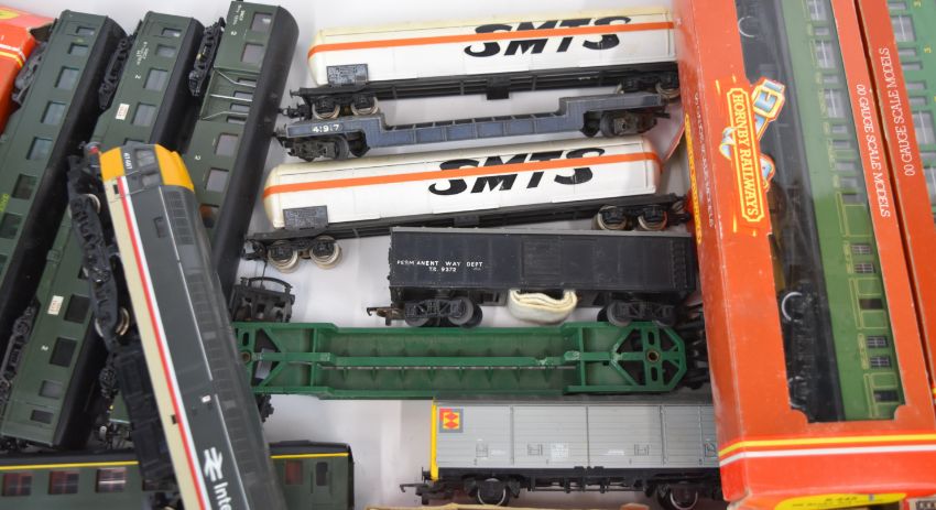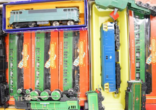 A collection of Hornby, Mainline and similar 00 gauge model railway engines and carriages.