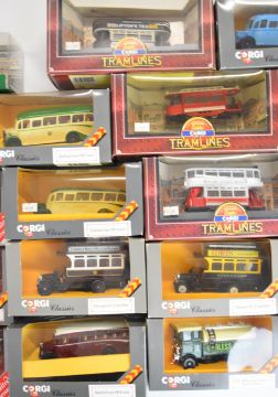 Thirty-four Corgi diecast model buses and trams to include Thornycroft, Bedford and AEC, all in original boxes.