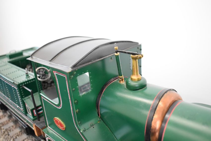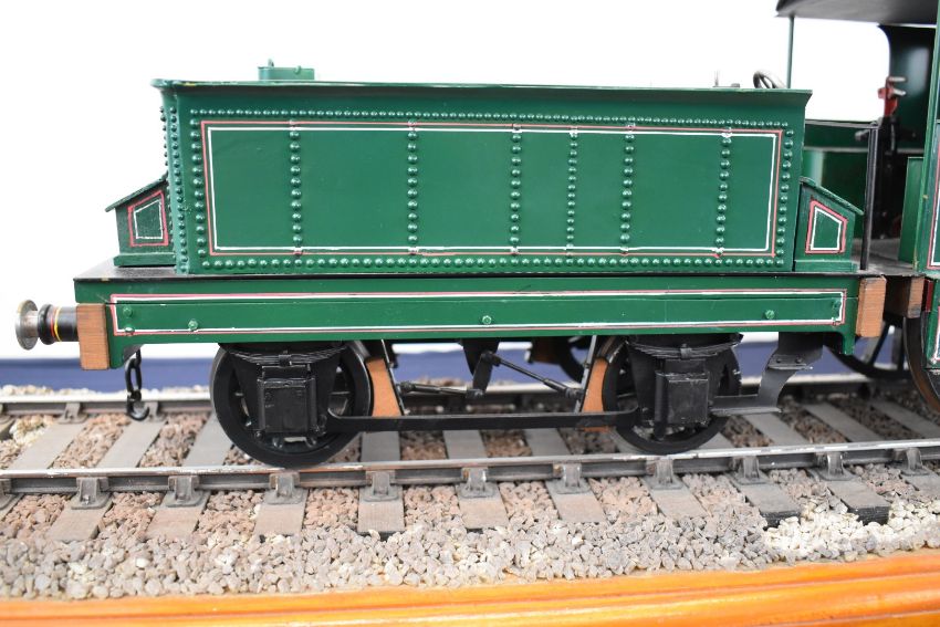 Prize winning exhibition standard 3½ inch gauge Highland Railway live steam 2-4-0 model railway locomotive Raigmore, as modified in 1869, built by the award winning late Harry Clyne. The silver soldered boiler fitted with twin safety valves, regulator and water level gauge, the twin outside cylinders having inside Stephenson's link valve gear controlled by a quadrant on the footplate, both engine and tender being sprung with leaf springs, the tender also featuring working hand wheel operated brakes, overall length 80cm
